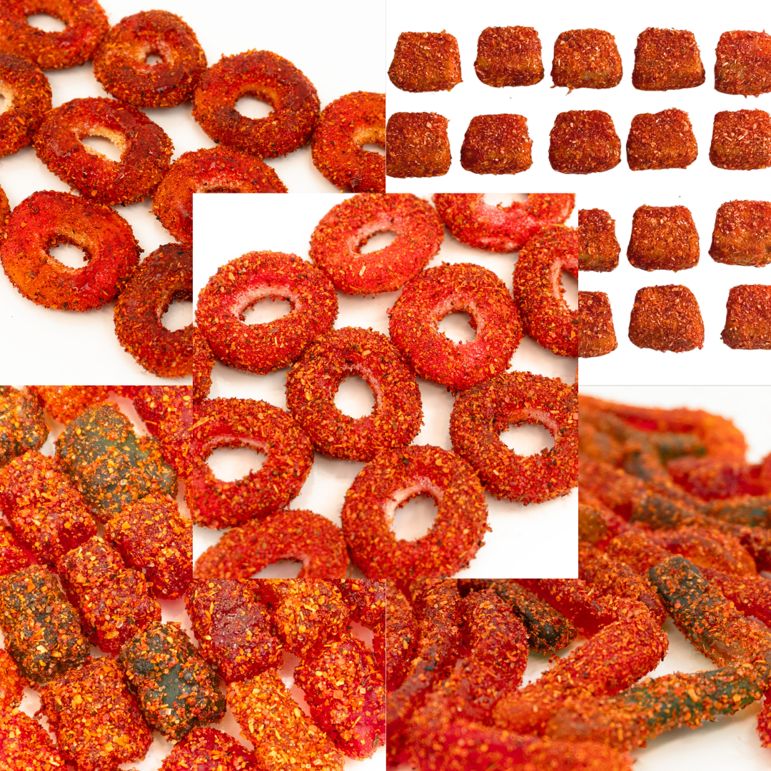 Vienen en paquetes de 5, 10, 15, 20 o 50 piezas surtidas (aros de durazno, aros de sandía, lombrices, rebanaditas y panditas) para que compartas un poco de picante y dulzura con todos tus seres queridos.